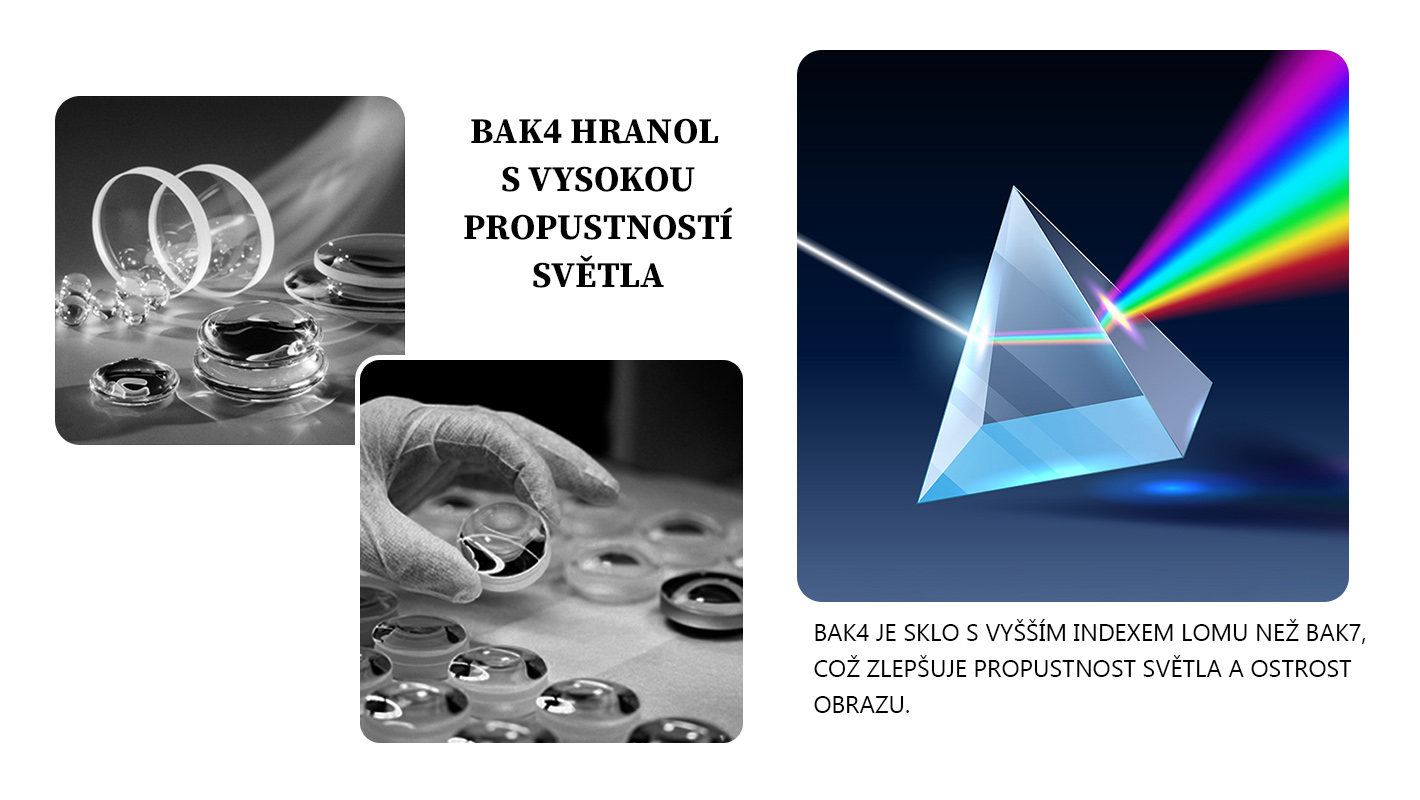 1. Hranol BAK4 s vysokou propustností světla. BAK4 má vyšší index lomu než sklo BAK7, což účinně zlepšuje propustnost světla a zajišťuje čisté zobrazení.